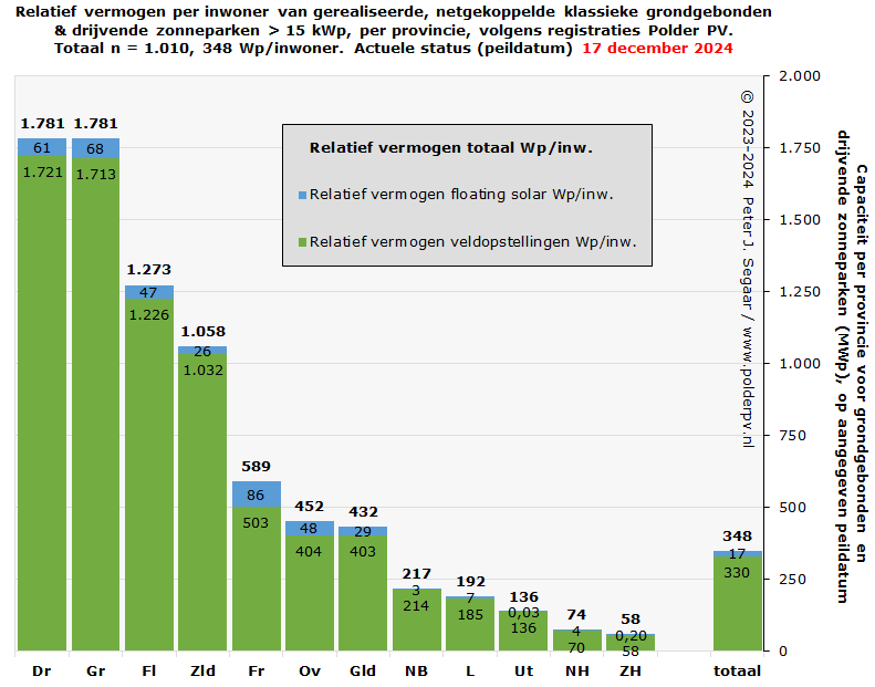 In een bericht in de Gelderlander van 8 oktober 2024, stelt van Hooff van branche organisatie Holland Solar, dat "30% van de zonnestroom in Nederland via zonneweides in het landschap" zou worden gegenereerd (en 40% op huizen van particulieren, en 30% op "grote daken van bijvoorbeeld bedrijven"). Als dit impliceert dat hiermee ook opgesteld vermogen zou zijn bedoeld, lijkt dit een overstatement van de werkelijkheid. Eind 2023 was er 5.451 MWp in veldopstellingen en drijvende zonneparken te vinden (zie tabel). Dat volume is "slechts" 22% van het totaal opgestelde volume aan PV capaciteit in Nederland, 24.302 MWp, volgens de meest recente CBS cijfers voor dat jaar. Medio 2024 was dat, met nog zeer voorlopige, later flink bij te stellen data, 5.798 / 26.065, nog steeds genoemde, ongeveer 22%. Wat verder, bovenstaande daargelaten, uiteraard een hoog, niet uit te vlakken volume is, wat een significante contributie is aan de verduurzaming van elektriciteit in ons land.