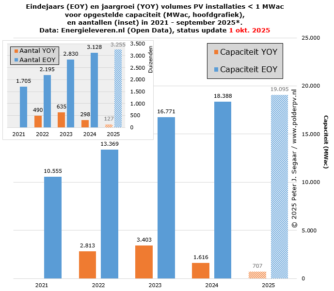 Met de toevoeging in september zijn er begin oktober 2025 in totaal nu bijna 3,26 miljoen PV installaties per stuk < 1 MWac bekend bij energieleveren.nl, volgens de optelling van de drie grootte-categorieën. Hierbij nogmaals de bekende disclaimer: dat is niet het aantal woningen, of dergelijke claims. Er worden immers zeer regelmatig uitbreidingen (= "installaties") aan bestaande projecten toegevoegd, zowel residentieel, als in de projecten markt, een endemisch verschijnsel in Nederland. Het aantal "objecten", "erven", "project sites", is, derhalve, altijd (veel) lager, dan bovengenoemd getal. Wat, desondanks, natuurlijk zonder meer een spectaculair volume blijft weergeven.