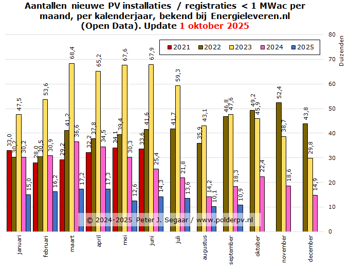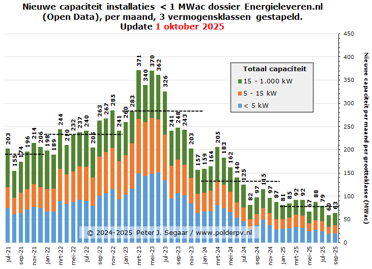 Februari tot en met april 2025 deden het marginaal beter, met 16.225, 17.235, resp. 17.329 nieuwe installaties, met een gezamenlijke AC capaciteit van 84,8, 92,1, resp. 91,9 MWac. Resulterend in gemiddeld vermogens van 5,22, 5,35, resp. 5,30 kWac per nieuwe installatie. In mei werd een nieuw dieptepunt bereikt, met nog maar 12.565 nieuwe registraties, resp. 67,2 MWac, en een gemiddeld vermogen van 5,35 kWac. De daarop volgende vakantie maanden juni tm. augustus voegden 88,2, 78,9, resp. een nieuw dieptepunt, 59,7 MWac toe, en 14.280, 13.565, resp., wederom het laagste niveau, 10.109 nieuwe registraties. Het gemiddelde per nieuwe registratie, opvallend hoog in juni (6,18 kWac), viel in juli tm. september weer terug naar 5,82, resp. 5,91 en 5,85 kWac per nieuwe registratie. Het niveau lag in september 2025, wat de aantallen registraties betreft, op een zwaar tegenvallende 41% t.o.v. de hoeveelheid in september 2024, wat zelf al 62% minder was dan het nieuwe volume in september van het recordjaar 2023.