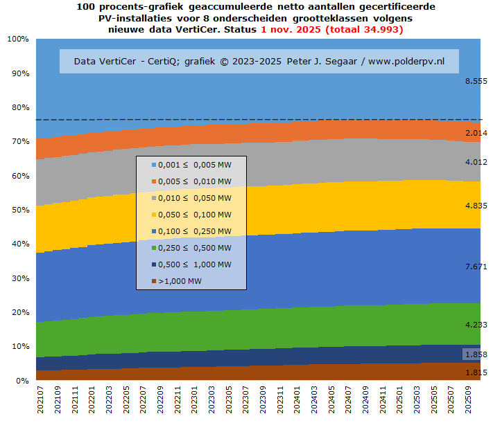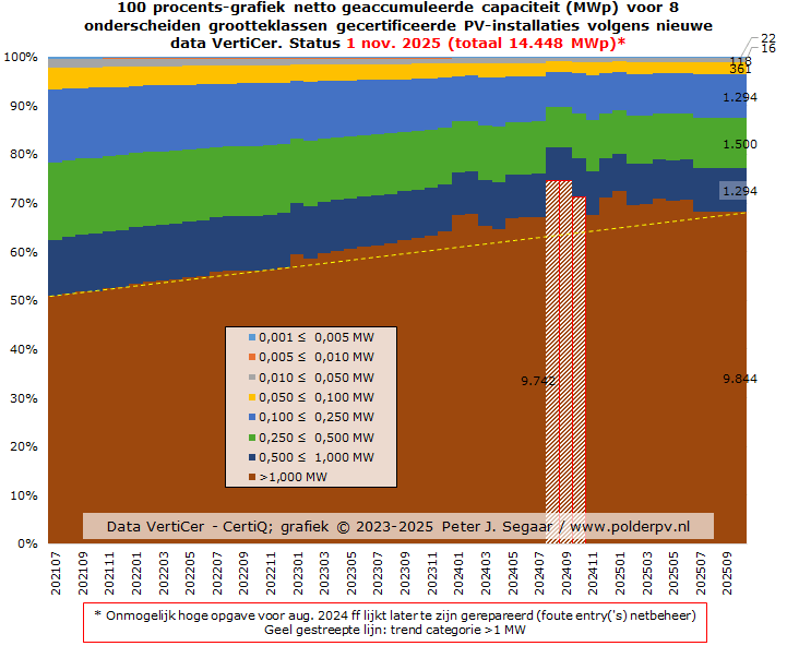 De geaccumuleerde gecertificeerde zonnestroom capaciteit in de database van VertiCer ligt, bijvoorbeeld, voor eind oktober 2025, flink lager dan voor het momenteel nog veel te hoge niveau voor eind 2024 / begin 2025, op ruim 14,4 GWp, en is daarmee nog steeds iets lager dan de huidig bekende accumulatie voor eind juli 2024, ruim een jaar eerder (!). De grootste project categorie (>1 MWp) zou een geaccumuleerd volume hebben bereikt van ruim 9,8 GWp, wat, by far, het grootste volume van alle grootte categorieën is, en ook zal blijven. De in een vorige update gemelde hoge capaciteits-toevoeging in het tweede kwartaal van 2024 is inmiddels uitgekomen op 982 MWp (pending latere updates), waarmee het record bij de netto kwartaal groeicijfers iets opwaarts is bijgesteld.