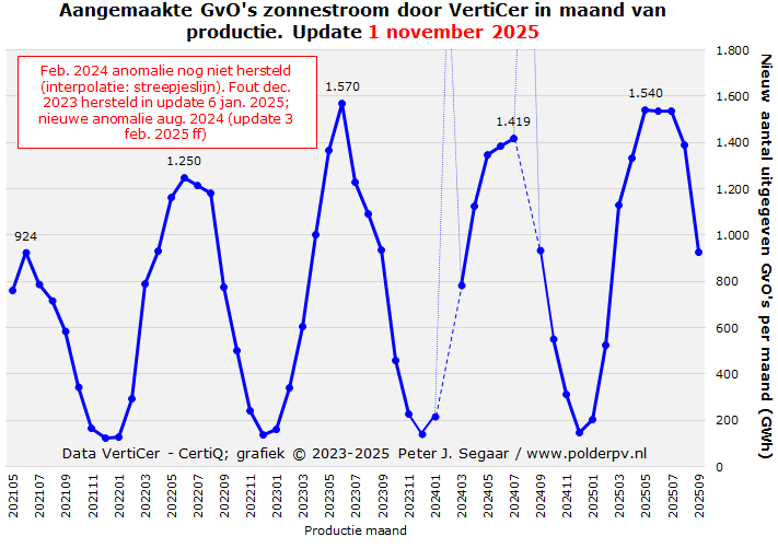 Ook zijn de verstrekte Garanties van Oorsprong voor gecertificeerde PV projecten gereconstrueerd en grafisch verbeeld over de afgelopen periode. Zowel de grote februari als de in een vorige update gemelde, en door VertiCer ook erkende grote augustus 2024 anomalie zijn nog steeds niet in de publiek toegankelijke data hersteld. Voor september 2025 zijn momenteel, voor de eerst bekende maandproductie afgegeven garanties van oorsprong geregistreerd van 925 gigawattuur, wat ongetwijfeld nog flink opwaarts bijgesteld zal gaan worden in latere updates. Het is nu nog 1,1% lager dan de tot nog toe bekende productie in september 2024, maar zal daar bij latere toevoegingen beslist overheen (kunnen) gaan.