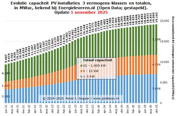 In de september 2024 rapportage werd het passeren van de piketpaal 18 GWac gemeld. Inmiddels is, eind augustus 2025, in alleen het sub 1 MWac segment, de 19 GWac grens gepasseerd. Eind oktober dit jaar staat nu een totaal volume van 19.162 MWac vermogen geaccumuleerd. 37% daarvan, een enorm volume van bijna 7,1 GWac, is bijna exclusief residentieel (installaties kleiner dan 5 kWac, blauwe segmenten in de grafiek).