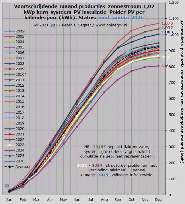 In deze grafiek alle maandproducties van het kern-systeem van 10 panelen (1,02 kWp) bijeen, met elk kalenderjaar een eigen kleur. 2026 heeft een eigen kleurstelling gekregen. Tot oktober 2001 waren er nog maar 4 panelen in het eerste systeem, en de producties daarvan zijn dan ook niet vergelijkbaar met de rest van de datapunten. Oktober 2010 was het hele systeem grotendeels afgekoppeld van het net, vandaar de zeer lage waarde voor die maand. Die wordt dan ook niet meegenomen in de berekening van het langjarige gemiddelde per maand, de dikke zwarte lijn in de grafiek.