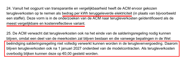 Met andere woorden (1), het voorstel is om niet verder te gaan met allerlei (onvergelijkbare) vastrechten, ingewikkelde staffels, e.d., maar om in ieder geval voor de modelcontracten een generiek tarief per ingevoede kilowattuur op te tuigen. De hoogte daarvan zal neem ik aan van de leverancier afhangen, vanwege verschillende over die leverancier uitgerolde profiel- en onbalanskosten, en verschillende aantallen zonnestroom invoedende klanten. M.a.w. 2: ook ná afschaffing van salderen, blijven deze kosten uitgerold worden over de zonnestroom invoedende klanten, in weerwil van suggesties, of, zo u wilt, "beloftes", van politici die suggereerden dat die kosten niet meer verhaald mochten worden vanaf 1 januari 2027. En dat is uiteraard wel zo eerlijk, wie kosten veroorzaakt, zal ook (deels) voor de vergoeding daarvoor moeten opdraaien. Daarbij moet ook direct worden gezegd, dat die kosten een stuk láger zullen worden, juist vanwege het afschaffen van de voor de zonnestroom klanten extreem lucratieve, inmiddels volstrekt achterhaalde salderings-regeling.