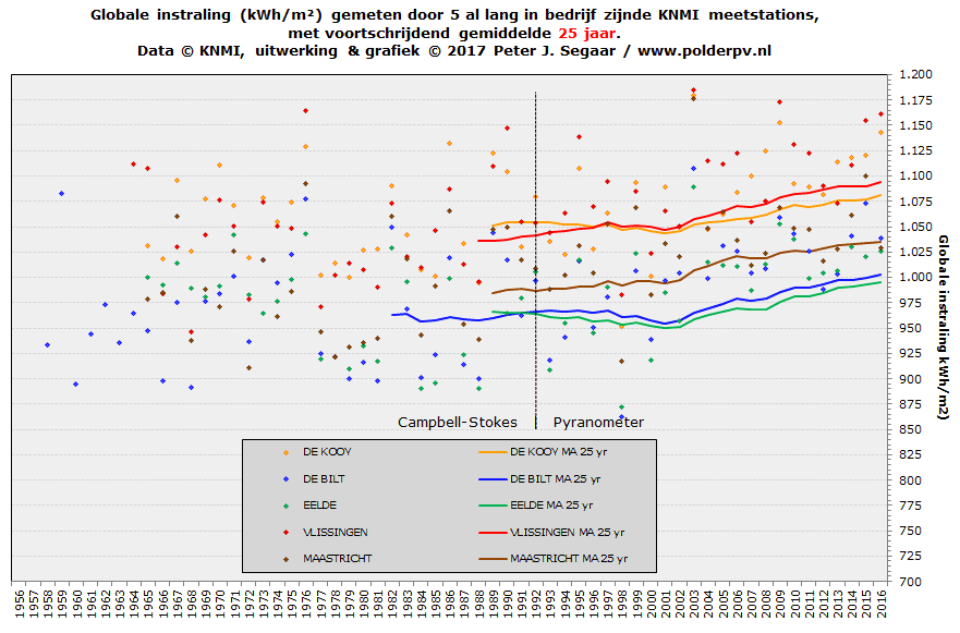 Aantal zonuren 2016 Volgens het voorlopige KNMI jaar rapport over 2016 waren "vrijwel alle maanden zonniger dan normaal* met als uitschieters september, december en in iets mindere mate november". Waarbij echter wordt gerefereerd aan "zonuren". Zoals we eerder hebben gezien, is dat niet hetzelfde als "hoeveelheid instraling" in genoemde maanden. Wederom ontving het kustgebied de meeste zonuren. De Kooy (NH) had er zelfs 2.046 in 2016. 300 uur meer dan "normaal", en ook een flink stuk meer dan 2015 "record houder" Vlissingen, waarvoor toen 2.007 zonuren werden genoteerd. Terwijl in 2015 het noordoosten van het land volgens het KNMI het minst zonnig was, is dat in 2016 Zuid Limburg geweest, met 1.718 zonuren. Hetgeen nog steeds 150 "zonuren meer dan normaal" was. Van alle individuele meetstations had Maastricht het laagste aantal zonuren, 1.717 in 2016. Ook Ell (gemeente Weert, midden-Limburg) zat daar met 1.725 zonuren niet ver van af. Bij de fysieke instraling is echter niet een Limburgse gemeente in 2016 "de klos", maar vliegveld Deelen (grotendeels op grondgebied gemeente Ede, Gld). Hier werd slechts een horizontale instraling van 368.212 J/cm² gemeten, wat echter nog steeds 3,9% boven het langjarige gemiddelde voor dat station is. * "Normaal" betreft de officiële referentie periode 1981 - 2010 (5) Voortschrijdend gemiddelde fysieke horizontale instraling 10 jaar Voor zonnestroom producenten is de arbitraire maat "aantal zonuren" geen goede referentie als het om potentieel aan zonnestroom productie gaat. Een PV systeem reageert namelijk direct op licht, en dan is de hoeveelheid fysieke instraling in kilowattuur per oppervlakte eenheid de doorslaggevende factor. Die hoeveelheid kan letterlijk van seconde tot seconde wijzigen, en dan heb je niet veel aan een slecht kwantificeerbare referentie als "zonne-uren". De fysieke instralings-data houdt KNMI ook bij, al is het helaas minder lang dan die voor het "aantal zonne-uren". De langste meetreeksen zijn wederom aanwezig voor bovengenoemde vijf KNMI stations, die data sinds 1958 (De Bilt) cq. sinds de zestiger jaren (4 andere locaties) registreren. Van die reeksen heb ik wederom twee grafieken gemaakt, de eerste geeft het 10-jarige voortschrijdende gemiddelde voor de globale horizontale instraling op 5 stations weer, in de afgeleide eenheid kilowatturen per vierkante meter (origineel worden de data in J/cm² weergegeven, de "J" komt van "Joule"). Niet verrassend: evenals het aantal zonuren, is ook de globale instraling op het horizontale vlak gemiddeld genomen (met de onvermijdelijke kleine bobbels en kuiltjes in de curves) flink toegenomen sinds eind tachtiger jaren. Die trend werd ook al ingezet vóórdat van meetsysteem werd gewisseld (de pyranometer metingen vervingen de Campbell-Stokes methodiek). De toename van de instraling mag gerust "opvallend" genoemd worden. Echter, sinds ik mijn eerste uitgebreide artikel over die forse toename schreef, bleef het op dat vlak angstaanjagend stil in zonnestroom liefhebbend Nederland. Ik ben benieuwd of die merkwaardige mediastilte blijft voortduren, of dat Polder PV een roepende in de woestijn blijft, op dat vlak. In 1987 ontvingen de 2 "somberste" meestations in deze specifieke reeks, De Bilt en Eelde, 914-924 kWh/m² aan zoninstraling. De kust stations Vlissingen en De Kooy zaten fors hoger, met waarden tussen 1.013 (Vlissingen) en 1.034 (De Kooy) kWh/m². Maastricht zat tussen deze twee groepen in, 954 kWh/m². Vanaf haar eerdere "dieptepunt" in 1981, het voortschrijdende gemiddelde voor de instraling op 964 kWh/m², zat er beduidend progressie in deze curve voor de Limburgse hoofdstad. En liet deze Eelde en De Bilt zelfs lange tijd achter zich, om de laatste jaren weer wat in te boeten (het verschil wordt weer kleiner). Gemiddeld genomen neemt de instraling voor alle stations toe, maar die voor de kuststations lijkt soms harder te groeien. Vlissingen en De Kooy eindigden in 2016 met het voortschrijdend gemiddelde ongeveer op gelijk niveau, tussen 1.114 en 1.115 kWh/m². Vlissingen "topte" in de voortschrijdende curve in 2012. Beide stations hebben de laatste jaren gemiddelde instralings-niveaus die beduidend hoger liggen dan de voortschrijdende gemiddeldes in de tachtiger jaren van de vorige eeuw lieten zien. Let in dit plaatje ook op de record hoeveelheid instraling in het jaar 2003 (losse datapunten). De kust stations hadden een enorm hoge geaccumuleerde instraling in dat jaar, Vlissingen zelfs 1.185 kWh/m². Maar zelfs het ver van zee liggende station Maastricht liet zich in dat exceptioneel zonrijke jaar beslist niet onbetuigd, met 1.176 kWh/m². Van de KNMI stations die in dat byzondere jaar 2003 meetwaarden hadden, waren er maar liefst 26 van de 33 die meer dan 400.000 J/cm² cq. ruim 1.110 kWh/m² aan gemeten jaarlijkse instraling lieten zien. Een niveau wat sindsdien ongeevenaard is. De webmaster van Polder PV is uiteraard blij dat hij dat zonrijke jaar volledig heeft meegemaakt, met tien "ronkende" zonnepanelen... (6) Voortschrijdend gemiddelde fysieke horizontale instraling 25 jaar Mocht u na de vorige drie grafieken nog twijfelen, zal die bij dit laatste exemplaar definitief worden weggenomen. Onherroepelijk kruipen de voortschrijdende gemiddelde curves bepaald over een langjarig traject van 25 jaar in deze eeuw langzaam maar gestaag omhoog. Soms tijdelijk een lichte terugval vertonend, of, zoals bij Vlissingen en Maastricht in de laatste jaren tm. 2015 een stabilisatie of "lichte groei". Maar vanaf begin deze eeuw is de gemiddelde stijging beslist goed zichtbaar. Dat betekent dat er meer licht op uw zonnestroom systeem valt. En dat u meer zonnestroom zult produceren, vermits deze meeropbrengst niet teniet wordt gedaan door onverwachte systeem fouten en/of degradatie van de hardware. Polder PV meet al jaren lang de opbrengsten van zijn eigen (deels bijna 15 jaar bestaande) systeem, en merkt nauwelijks iets van verminderde opbrengsten. Sterker nog, 2015 was weer een prima jaar. Zie 