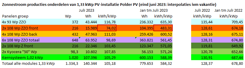 In dit artikel worden de (afgeleide) primaire productie gegevens van Polder PV's oude PV-systeem voor juli 2023 weergegeven. De data zijn verkregen uit (normaliter) maandelijkse meterstand opnames van de 13 micro-inverters van onze, voor het kern-systeem inmiddels minimaal 22 jaar oude PV installatie (netkoppeling 1e vier zonnepanelen: 13 maart 2000; 2e set van 6 op 12 oktober 2001, gevolgd door kleinere toevoegingen in 2007 en 2010). De meterstanden voor begin juli waren vanwege onze vakantie geïnterpoleerd m.b.v. de instralingsgegevens van het KNMI station Voorschoten, "bij ons om de hoek". De tabel met de producties van de verschillende "sets" zonnepanelen van Polder PV. Zoals eerder uitgelegd zijn deze voor eind juni ge-interpoleerd uit voor en na de vakantie uitgelezen meterstanden van de 13 micro-inverters. Deze standen zijn ook gebruikt voor het bepalen van de productie in juli. Deze is links in de tabele weergegeven; in het 2e blok de resultaten voor januari tm. juli 2023; helemaal rechts ter vergelijking de ook ge-interpoleerde specifieke productie in juli 2022, resp. in de periode jan. - juli 2022. Naast het opgestelde vermogen in Wp wordt de productie per groep in Wattuur (Wh) vermeld, ernaast de belangrijke afgeleide specifieke opbrengst (in kWh/kWp, hetzelfde als Wh/Wp), waarmee de uit verschillende vermogens bestaande deelgroepjes goed vergeleken kunnen worden. De "beste" specifieke opbrengsten in juli 2023 werden wederom door onze oudste set panelen, 4 stuks 93 Wp modules, op 1 juli 2023 reeds 8.540 dagen productief sedert de netkoppeling in maart 2000, behaald, 116,8 kWh/kWp. Dat is wel flink lager dan in de zeer zonnige voorafgaande maand juni (144,9 kWh/kWp). Bij de 2 in de voorste rij staande 108 Wp modules zijn de in de vorige maand al gerapporteerde tegenvallende resultaten gecontinueerd, met slechts 74,0 kWh/kWp in die maand (rode band, donker rood omlijnd). Vermoedelijk een slechte verbinding betreffend. Belangrijk bij dit soort rapportages is, dat juist dit soort incidenten direct opvallen. Actie moet nog worden ondernomen, dat is in onze situatie helaas niet simpel. De verliezen zijn gelukkig, vanwege de micro-inverter set-up van onze installatie, beperkt, en we houden desondanks waarschijnlijk toch zonnestroom productie over op jaarbasis, als de problemen niet structureel erger gaan worden. Het kern-systeem van 10 panelen / 1,02 kWp (lichtgroene band) had in deze middelmatige zomermaand een opbrengst van ruim 107 kWh, wat neerkomt op een specifieke opbrengst van 105,3 kWh/kWp. In Polder PV's productie historie is dat, na de duidelijk bovengemiddelde productie in juni, ditmaal de op twee na slechtste juli maand. Het kan vriezen, en het kan dooien. Ook bij de opbrengsten van januari tm. juli komt een vergelijkbaar beeld naar voren, met de oudste 4 panelen het best presterend (ruim 635 kWh/kWp), en de 2 in de voorste rij staande oude 108 Wp modules het slechtst, met 483 kWh/kWp (24% slechter presterend dan eerstgenoemde groep, vermoedelijk vanwege een slechte verbinding). Volgens het KNMI werd juli gekarakteriseerd met "Vrij nat, qua temperatuur en zonneschijn normaal", met iets minder dan gemiddelde hoeveelheden zonuren, 213 t.o.v het langjarige gemiddelde (1991-2020), van 220. Terschelling voerde de vlag met 238 uren, Deelen op de Veluwe was rode lantaarndrager, met slechts 195 zonuren. Het langjarig metende "gemiddelde" station de Bilt zat met 201 zonuren beduidend onder het langjarige gemiddelde van 214 uur. Periode vanaf start van het jaar Helemaal rechts in de tabel vindt u de specifieke opbrengsten gehaald in juli, en in de periode januari tm. juli in het zonnige jaar 2022. Deze zijn voor juli 2022 allemaal substantieel hoger dan de resultaten in juli 2023, vanwege de beduidend betere weers-omstandigheden. Ook voor het tijdvak januari tm. juli moet 2023 het duidelijk afleggen tegen dezelfde periode in zonnig 2022. Dit is een indicatie van de soms forse verschillen van gelijkwaardige productie tijdvakken, tussen maanden en jaren onderling. Voor het hele systeem was de output in juli 2022 22% hoger dan in juli 2023 (!). Voor de periode januari tm. juli 2022 was het ruim 16% hoger dan in dezelfde periode in het huidige jaar. 2023 is tot nog toe dan ook beslist een tegenvallend jaar wat zon input, en dus ook zonnestroom productie betreft. Wat nog wat verslechterd is door de problemen met 1 van de inverter / paneel combinaties. Juli 2023 kwam bij Polder PV qua productie van zonnestroom op de twee-na-laatste plaats in de "juli rating" sedert 2001, met 106 kWh (interpolatie) voor de kern-installatie met 10 panelen, voor juli 2021, resp. 2020. En iets onder juli 2011. In deze grafiek alle maandproducties van het kern-systeem van 10 panelen (1,02 kWp) bijeen, met elk kalenderjaar een eigen kleur. 2023 heeft een lichtgele kleurstelling. Tot oktober 2001 waren er nog maar 4 panelen in het eerste systeem, en de producties daarvan zijn dan ook niet vergelijkbaar met de rest van de datapunten. Oktober 2010 was het hele systeem grotendeels afgekoppeld van het net, vandaar de zeer lage waarde voor die maand. Die wordt dan ook niet meegenomen in de berekening van het langjarige gemiddelde per maand, de dikke zwarte lijn in de grafiek. De spreiding van de productie is voor deze vroege zomer-maand hoger dan in juni. De extremen liggen voor juli tussen de 104 kWh (juli 2020) en 149 kWh (juli 2006, zie ook animatie). In deze vergelijkbare grafiek zijn alleen de maandproducties van de laatste vier jaar getoond. In het huidige nieuwe exemplaar is, sedert het eerste maandrapport voor dit jaar, 2019 verwijderd, en 2023 toegevoegd (met nieuwe kleurstelling). Zelfs in zo'n relatief korte periode zijn de verschillen soms groot, met name in de lange zomerse periode. En komen ook buiten het hoge productie seizoen soms flinke extremen voor, zoals de record productie in maart 2022, en, daar tegenover staand, het zwaar tegenvallende resultaat in dezelfde maand in 2023. In mei is het versch